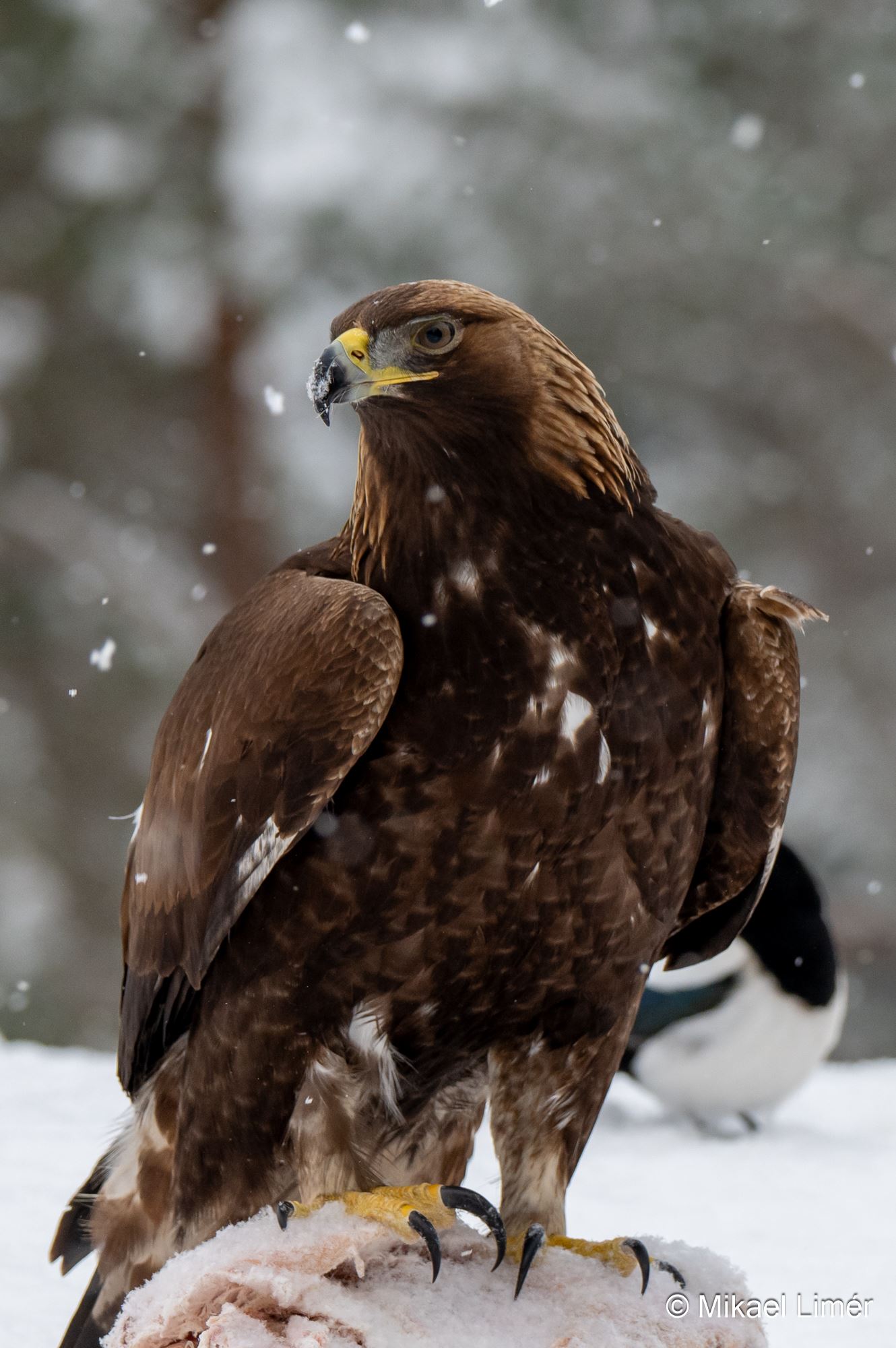 Skatorna som suttit bredvid örnen och ätit fortsätter äta till och från (några retfulla nyp i örnens stjärtfjädrar gör dom också..) när dom är borta kommer småfåglarna fram och även enstaka Korp och Kråka är nere och äter.